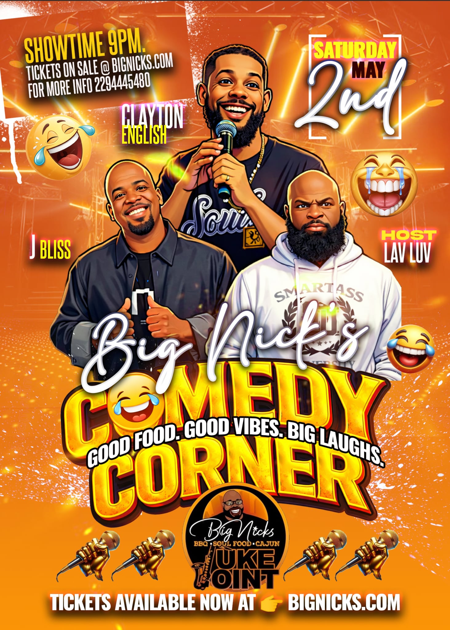 😂🔥 BIG NICK’S COMEDY CORNER 🔥😂 Get ready for a night of nonstop laughs! 📅 Saturday, May 2nd🎤 Featuring: Clayton English & J Bliss🎙 Hosted by: Lav Luv ⏰ Showtime: 9PM Good food. Good vibes. BIG laughs. You already know how we do it at Big Nick’s! 🎟 Tickets available now at 👉 bignicks.com 📍 1201 Baytree Rd, Valdosta, GA #BigNicks #ComedyCorner #ValdostaEvents #LiveComedy #ClaytonEnglish #JBliss #LavLuv #NightOut #DateNight #LaughsOnDeck