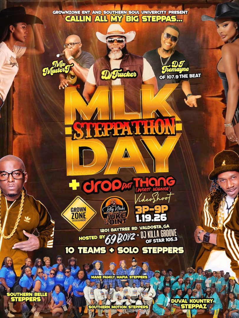 CALLIN’ ALL MY BIG STEPPAS! 💥Grownzone ENT & Southern Soul University bring you the MLK Steppathon Day – an electric celebration of dance, soul, and culture. Hosted by 69 Boyz & DJ Killa Groove, with special guests:🎧 DJ Trucker🎤 Mix Master T🎶 DJ Tremayne (107.9 The Beat) 🔥 Featuring 10 Teams + Solo Steppers🎬 Includes the official “Drop Dat Thang (Worst Behavior)” video shoot📍 Big Nick’s – 1201 Baytree Rd, Valdosta, GA🕒 3PM–9PM | Sat, Jan 19 |