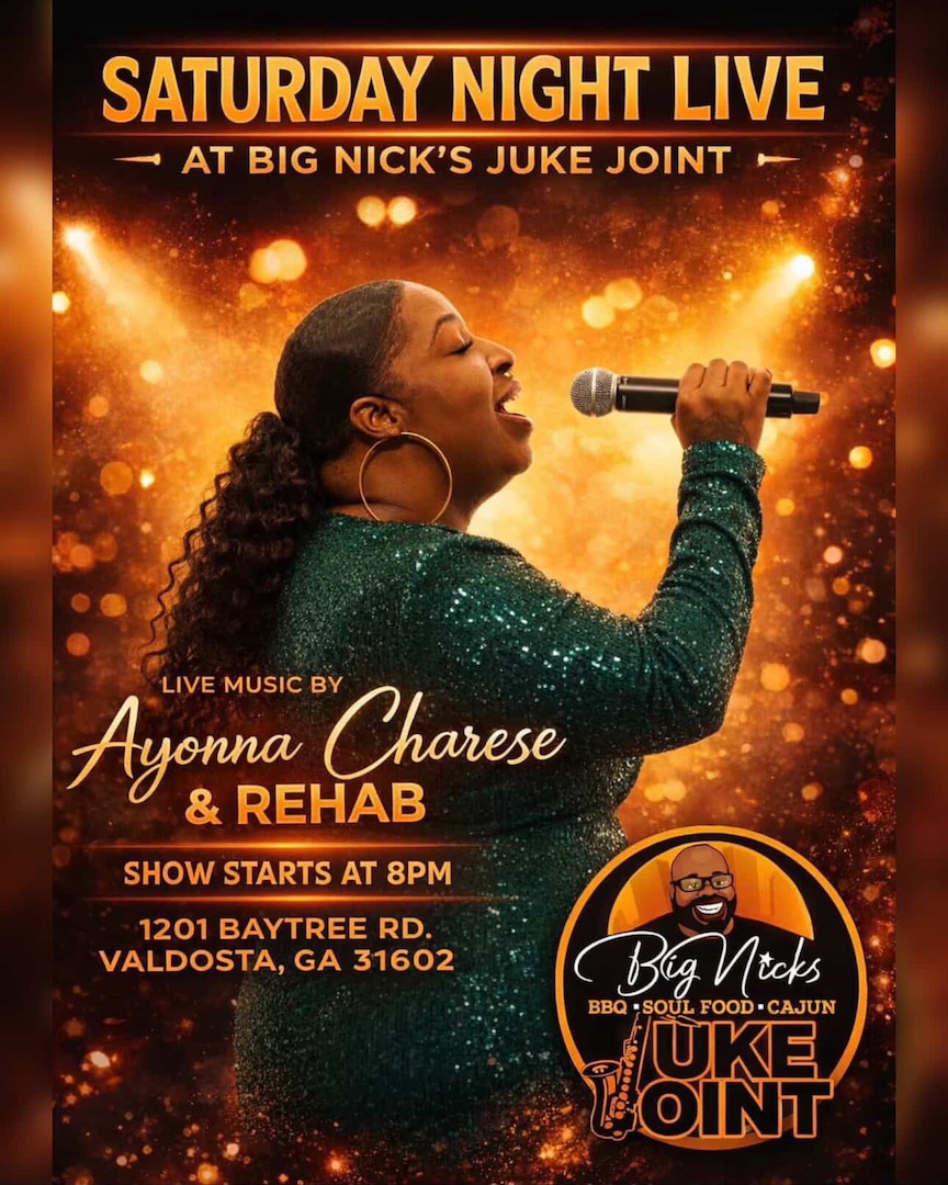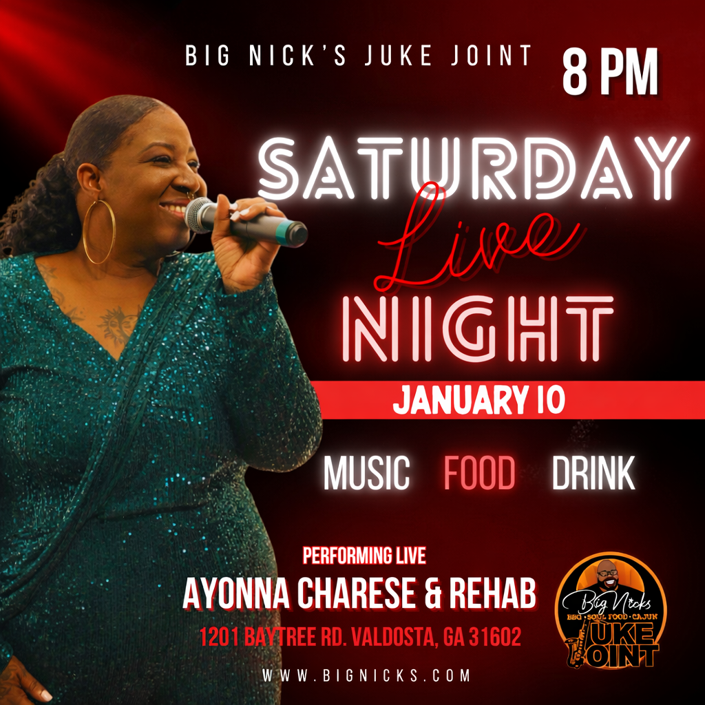 Get ready for a soulful Saturday night as Ayonna Charese and her band Rehab bring the heat to Big Nick’s Juke Joint. From powerhouse vocals to smooth live instrumentation — it’s the grown folks’ vibe you’ve been waiting for. 🗓️ Date: Saturday ⏰ Time: 8:00 PM📍 Location: Big Nick’s Juke Joint 1201 Baytree Rd, Valdosta, GA 31602 🔥 Delicious Cajun, Soul Food & BBQ available all night🎷 Live entertainment in a true juke joint atmosphere No better place to spend your Saturday night! |