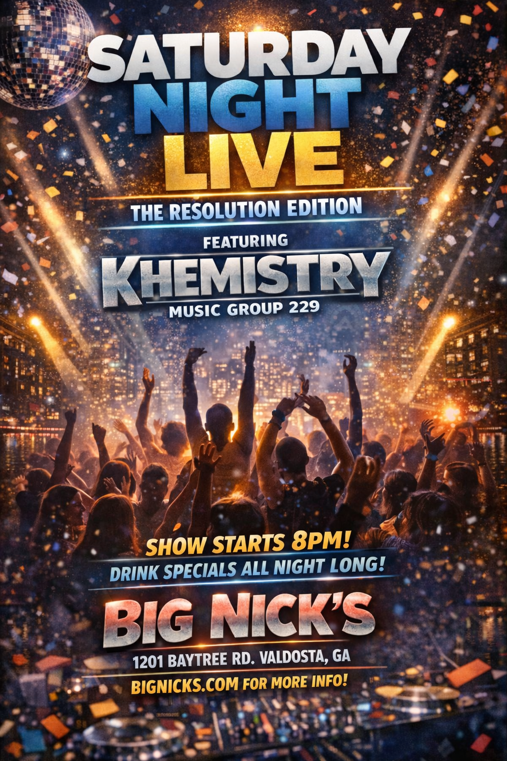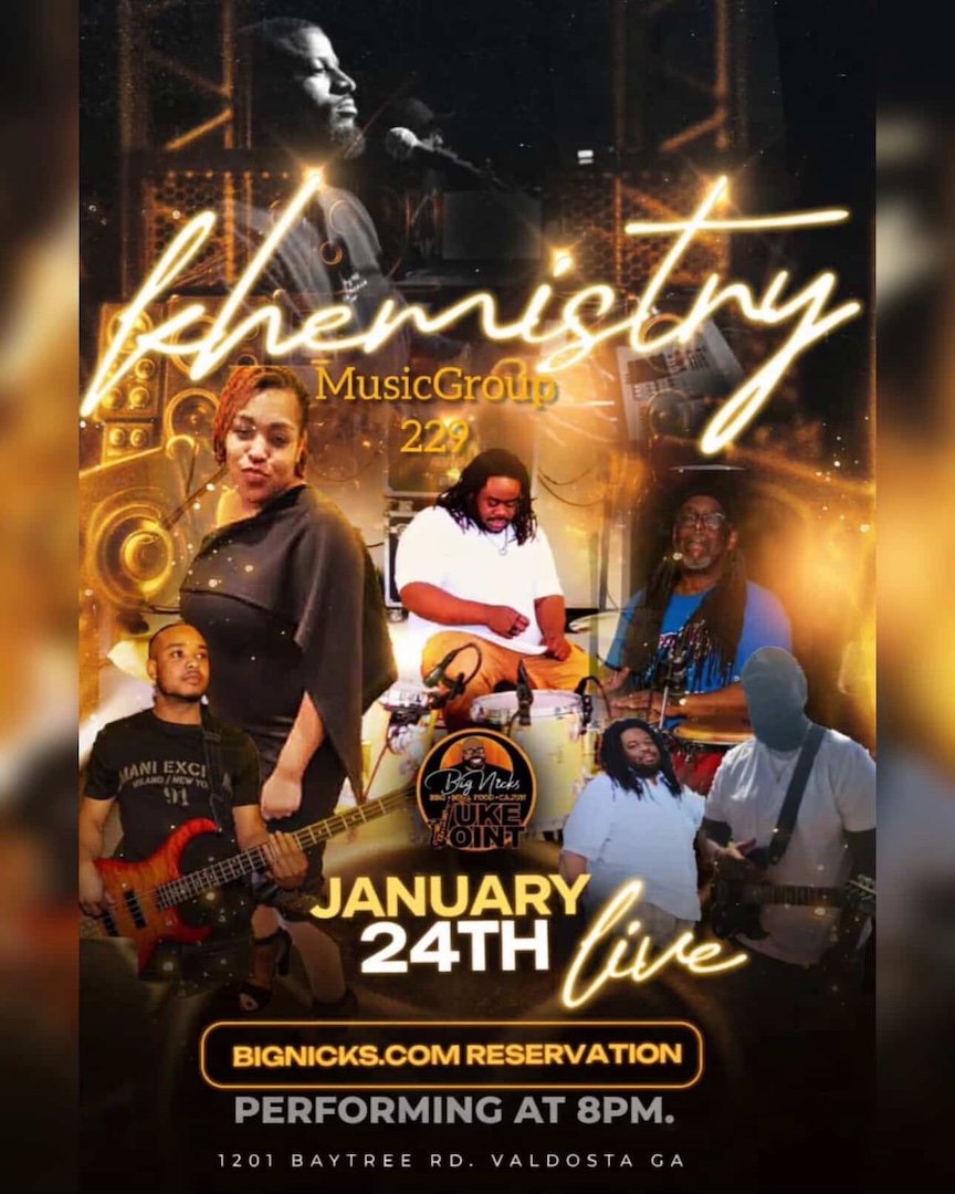 Join us for an unforgettable night of live music featuring the Khemistry Music Group (229) — bringing soul, groove, and high energy to the stage! 🗓️ Date: Friday, January 24th, 2026⏰ Time: 8:00 PM📍 Location: Big Nick’s Juke Joint 1201 Baytree Rd, Valdosta, GA🔗 Reservations: bignicks.com/reservation Pull up with your crew for good food, great music, and grown folks’ vibes. Secure your spot early! |